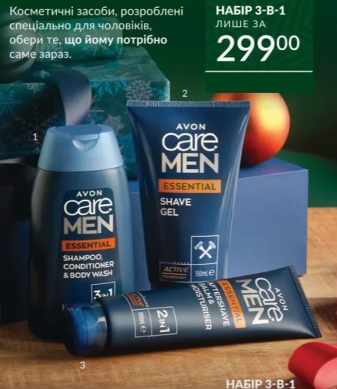 Набор для мужчин Avon Care MEN «Основной уход» Забудь про неприятные ощущения после бритья с нашей линейкой средств для чувствительной кожи. Комфорт уже после первого применения. Убедись сам и покупай в наборе. В наборе: • 2-в-1 Бальзам после бритья и увлажняющий крем «Основой уход» | 100 мл | | • Гель для бритья «Основной уход» | 150 мл | • 3-в-1 Шампунь, кондиционер и гель для душа «Основной уход»