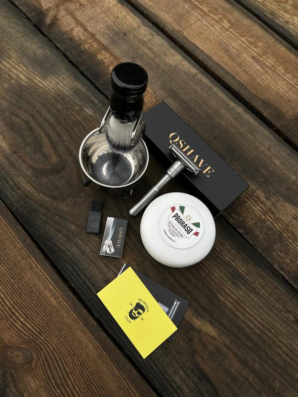Набор для бритья ◾️Т-образный станок ◾️Лезвие ◾️Щеточка для чистки ◾️Чаша с двойными стенками ◾️Помазок ◾️Стойка ◾️Мыло для бритья ➖Для качественного бритья не требуются многолезвенные кассетные системы, вполне достаточно и одного. Поэтому классические т-образные станки снова набирают популярность. Отличный подарок мужчине! -- Тяжелый станок, приятно держать в руке! -Регулируемая безопасная бритва Qshave с двойным краем в подарочной коробке. Бритва имеет 6 позиций выбора агрессивности бритья. -Очень приятное на ощупь матовое покрытие. В комплект входит 5 шт. титановых лезвий и щеточка для чистки. -Замена лезвия осуществляется в считанные секунды: крышка крепится с помощью пружин и очень просто открывается. ➖ В состав набора также входят помазок, чаша для бритья, специальная стойка (подставка), которая поможет компактно держать помазок и чашу, не занимая много места. Ручка помазка изготовлена из дерева, чаша изготовлена из нержавеющей стали. ➖Мыло для бритья Proraso White 150 мл Мыло Proraso для чувствительной кожи Мыло входит в косметическую серию Белая Линия и разработано специально для чувствительной кожи. Поэтому в его составе есть масло зеленого чая и экстракт овсяной муки. Оно хорошо тонизирует чувствительную кожу лица и придает ей мягкость и свежесть. Предотвращает появление раздражения. Мыло отлично подходит для любого типа кожи. Рекомендации по применению: после того, как смочите лицо теплой водой, взбейте помазком мыльную пену в чаше и нанесите пену на лицо. Пена очень хорошо размягчит волоски щетины, и они станут более податливыми при бритье.