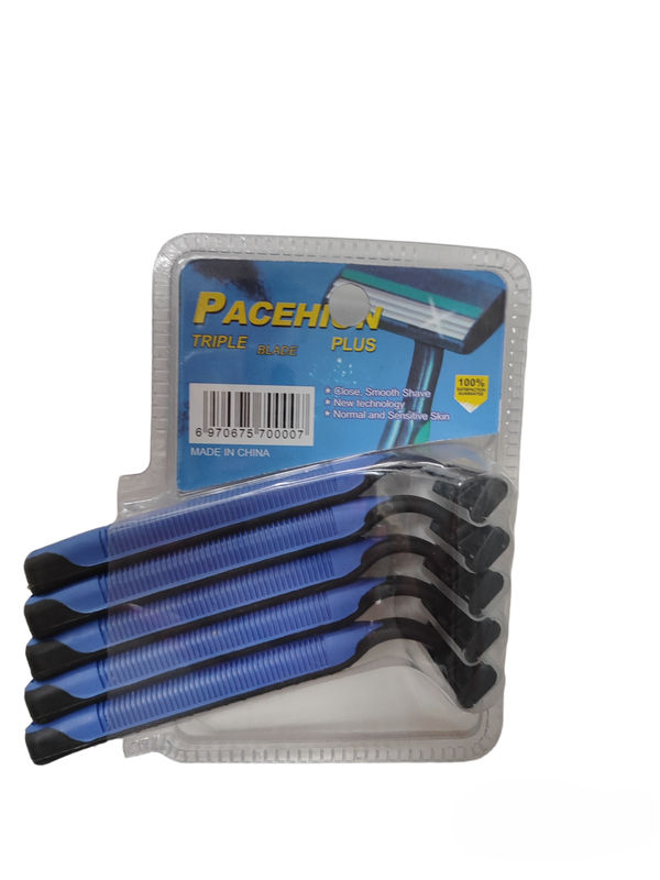 Пластиковые бритвы с прорезиненной ручкой, плавающей головкой с 3-мя стальными лезвиями и увлажняющей полоской. На блистере (9 х 10,5 см): 5 штук в наборе.