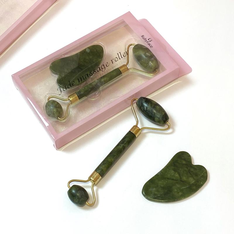 Нефритовый набор: роллер (двусторонний) + скребок гуаша ruby face