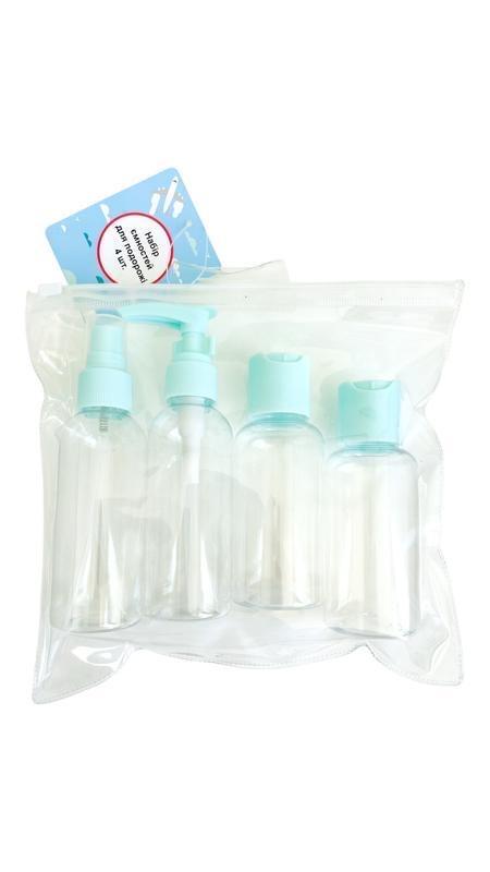 Набір ємностей для подорожі 4 шт. Ємність для лосьйону 2 шт-80 ml Ємність з распилювачем 1 шт-80 ml Ємність з помпою 1 шт-80 ml