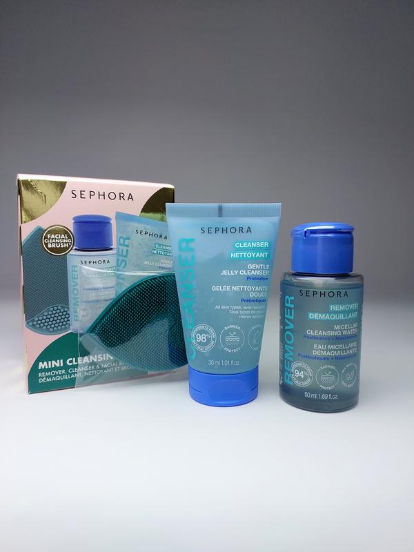 Мини набор для очищения кожи лица SEPHORA. - Мицеллярная вода для снятия макияжа 50 мл. • Средство быстро снимает макияж и поддерживает кожный барьер. • Подходит для всех типов кожи. • Содержит постбиотики для питания и ниацинамид для увлажнения и заметного разглаживания кожи. • Не требует смывания. • Продукт веганский, без глютена. - Очищающий гель для лица 30 мл. • Подходит для всех типов кожи. • Средство не содержит сульфатов и имеет нейтральный pH. • Очищает лицо, шею и зону вокруг глаз, поддерживая кожный барьер. • Оставляет кожу мягкой и увлажненной до восьми часов после использования. - Силиконовая щеточка для лица, подходит для тщательного очищения кожи лица.