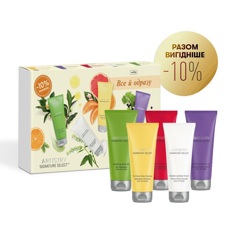 Хотите иметь собственный спа-салон прямо у себя дома? Благодаря набору «Все и сразу» от Artistry Signature Select™ вы можете ухаживать за своей кожей тогда, когда вы этого захотите. Попробуйте разные варианты, комбинируйте их между собой и наслаждайтесь роскошным спа-уходом! Позаботьтесь о своей коже вместе с разнообразными по текстуре и ароматам средствами, используя их в технике бодимаскинг. Перед началом ритуала красоты предварительно очистите кожу, для чего достаточно принять обычный расслабляющий душ. Рецепт красоты «Все и сразу» 1. Смягчающий и очищающий гель для душа. Начните спа-уход за своим телом с очищения. Гель во время использования превращается в невесомую ароматную пену, нежную, словно облако. В его составе фитокомпоненты Nutrilite™: эфирные масла вечерней примулы и периллы – для питания, смягчения и увлажнения кожи; цитрусовые экстракты – для усиления естественного защитного барьера и предохранение кожи от пересыхания, загрязнения и негативного воздействия факторов окружающей среды. В конце процедуры просто смойте остатки геля под проточной водой. 2. Отшелушивающий скраб для тела. На втором этапе важно дополнительно смягчить и очистить кожу. Приятный бонус – антицеллюлитный эффект скрабирования. Чтобы достичь наилучшего результата, двигайтесь снизу вверх, делайте это очень аккуратно и бережно. Смесь эфирных масел периллы, вечернего первоцвета и асаи подарит настоящее расслабление. Экстракт черной смородины Nutrilite™ сделает кожу еще более нежной и упругой. В конце скрабирования смойте остатки продукта с кожи. 3. Антицеллюлитный лосьон с лифтинговым эффектом. Третий этап роскошной спа-процедуры. Чтобы сделать кожу максимально подтянутой, гладкой и красивой, массажными движениями вотрите лосьон в проблемные зоны. Делайте процедуру по утрам и вечерам. В составе фитокомпоненты с сертифицированных плантаций Nutrilite™: кофеин; масло кофейных зерен; экстракт морских водорослей; экстракт гранатовых зерен. 4. Питательный крем для выравнивания кожи. На этом этапе натуральные компоненты Nutrilite™ дополнительно позаботятся о вашей коже: экстракт семян белой чиа и масло вечернего первоцвета напитают клетки полезными веществами и усилят барьер, удерживающий влагу; экстракт вишни ацеролы в составе эксклюзивного осветляющего комплекса подарит коже особое сияние. 5. Увлажняющий защитный гель. Наносится после душа для защиты кожи от негативных внешних воздействий и глубокого увлажнения в течение 48 часов. Благодаря интеллектуальной формуле гель подстраивается под индивидуальные особенности кожи и может регулировать степень ее увлажненности. В составе продукта компоненты, собранные с экологически чистых полей Nutrilite™: экстракт цветов персика и листьев зеленого чая – для защиты кожи от разрушительного влияния свободных радикалов и других негативных факторов. Применение В теплое время года регулярно дополняйте уход защитным увлажняющим гелем. Наносите его на слегка влажную кожу круговыми движениями, начав со ступней и заканчивая зоной декольте и шеей. В холодное время года чаще используйте питательный выравнивающий крем. Колени, ступни и локти регулярно скрабируйте, чтобы сделать кожу в этих зонах более мягкой и нежной. Свойства Что представляет собой бодимаскинг? Это особая программа ухода за телом, состоящая из нескольких по
