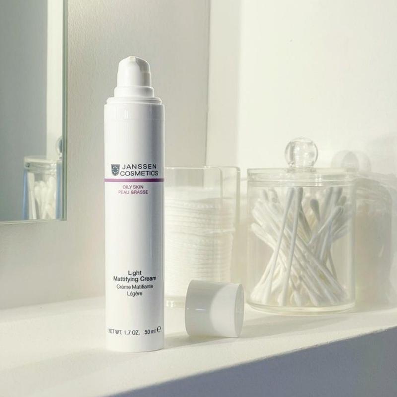 JANSSEN Oily Skin New Light Mattifying Cream - Легкий матуючий крем Доведено, що цей легкий 24-годинний догляд для жирної, схильної до появи плям шкіри з інноваційним комплексом Equal Refining та гіалуроновою кислотою зменшує блиск шкіри та розширені пори. Крім того, алое віра має заспокійливу дію, а кремнезем забезпечує миттєвий матуючий ефект. Спосіб застосування: Нанесіть легкий крем на очищену шкіру вранці та/або ввечері і м'яко вмассируйте. Також підходить як основа під макіяж.