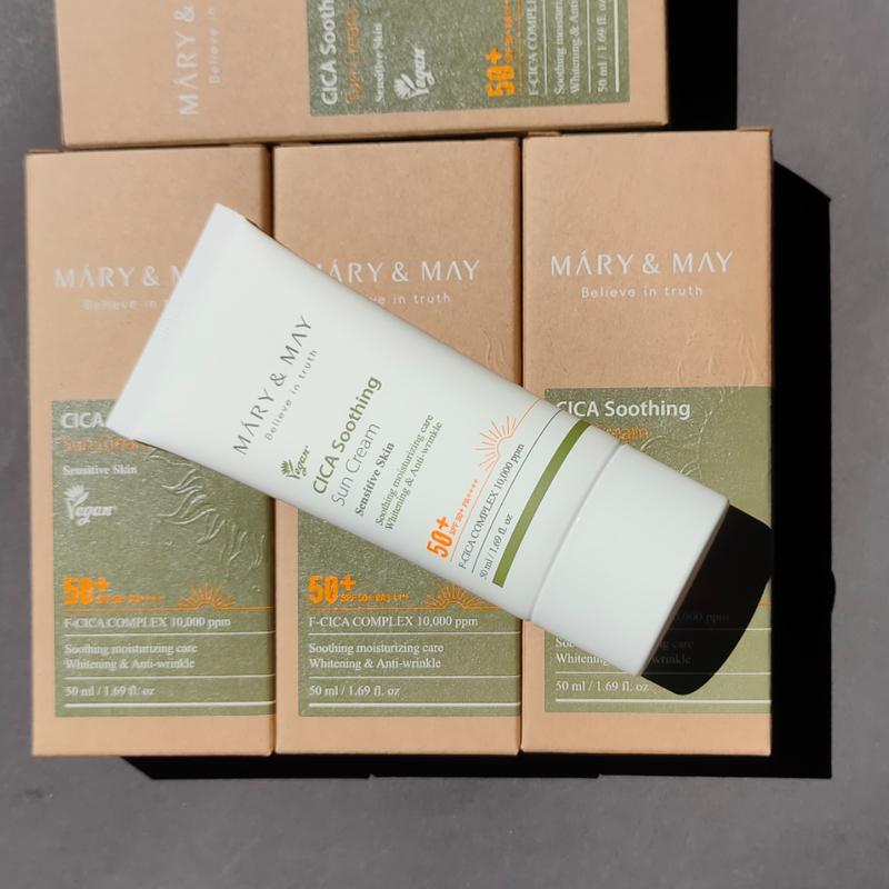Mary&May CICA Soothing Sun Cream Легкий, заспокійливий сонцезахисний крем SPF50+/PA++++ на основі комплексу ферментованої Центели та Хімічних фільтрів, рівною мірою забезпечує надійний захист від шкідливих впливів сонячних променів, а також сприяє заспокійливій і пом'якшувальній дії. Склад сонцезахисного крему збагачений ферментованим комплексом Cica (10,000ppm), який складається з Центели Азійської та 6 різновидів її активних компонентів (витяжки). Центела Азійська, відома як Тигрова трава, має чітко окреслені загоювальні, протизапальні та регенерувальні властивості, завдяки чому допоможе зняти подразнення й запалення шкіри. Інозитол або Вітамін В8 захищає клітини від стресу довкілля, як-от окислювальний (УФ-випромінювання) і термічний стрес (залежання), контролюючи водний баланс дерми. Бетаїн пом'якшує поверхню шкіри та робить її шовковистою. Ніацинамід — водорозчинний вітамін В3, здатний блокувати синтез меланіну, що сприяє зменшенню почервоніння й пігментних плям, вирівнює тон шкіри обличчя та надає сяйва. Сонцезахисний засіб має найлегшу текстуру, яка швидко вбирається й не обважнює шкіру, не залишає білого нальоту або відчуття липкості після нанесення. Усі інгредієнти в складі Mary&May CICA Soothing Sun Cream сертифіковані EWG і безпечні для використання. Засіб протестований дерматологами та визнаний безпечним для чутливої шкіри обличчя. Продукція не тестується на тваринах (Cruelty Free). Продукт не містить шкідливих хімічних комопентів, здатні викликати алергічні реакції та є “Reef Safe” — безпечним для рифів. Застосування: рівномірно розподілити крем поверхнею обличчя на останньому етапі процедури догляду за шкірою. Рекомендується наносити засіб не менш ніж за пів години до виходу на вулицю. Оновлювати що 2-3 години. Об'єм: 50 мл.