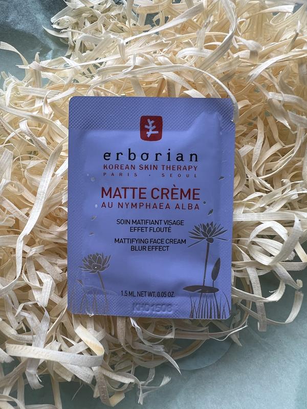1+1=3 пробник с наименьшей стоимостью в подарок Матирующий крем для лица Erborian Matt Cream 1,5 ml Бархатистый финиш с блюр-эффектом, интенсивное увлажнение в течение долгого времени, сужение пор и уменьшение жирности эпидермиса — все это обеспечивает роскошный матирующий крем для лица, разработанный брендом Erborian. Активные вещества в составе продукта поглощают излишки себума, устраняя неэстетичный блеск. При этом компоненты крема образуют на поверхности кожи тонкий защитный барьер, который препятствует потере влаги в течение дня. Erborian Matt Cream визуально выравнивает рельеф эпидермиса, придавая ему изысканное матовое свечение. Средство способствует усилению барьерных функций кожи, что крайне важно для ее здоровья. Крем обогащен экстрактом корейской белой лилии. Он отлично подготовит кожу к нанесению тональных продуктов.