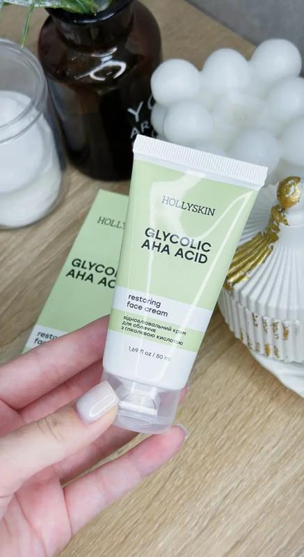 Восстанавливающий крем с гликолевой кислотой HOLLYSKIN Glycolic AHA Acid Face Cream, 50 ml Крем с гликолевой кислотой мягко отшелушивает кожу лица, разглаживает и осветляет ее, ускоряет обновление клеток, предотвращает появление и устраняет возрастную и сезонную пигментацию. Масло абрикосовых косточек питает кожу, смягчает и успокаивает ее, улучшает цвет лица, устраняет следы усталости. Масло авокадо благодаря содержанию омегакислот нейтрализует действие свободных радикалов, повышает упругость и эластичность кожи, устраняет пигментацию. Сквалан защищает лицо от вредных внешних воздействий, увлажняет и восстанавливает его, способствует более глубокому проникновению витаминов и микроэлементов. Содержание гликолевой кислоты - 3%