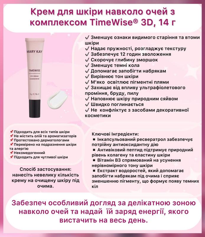 Твои глаза заслуживают всего самого лучшего!✨ Использование крема для кожи вокруг глаз Time Wise Age Minimize 3D Mary Kay является важной частью ежедневной процедуры ухода за кожей🧖🏻♀️, поскольку первые проявления старения появляются именно в области вокруг глаз. Ведь он: ✨Заметно уменьшает количество морщин и минимизирует проявления усталости, среди которых темные круги и отеки под глазами. ✨Мгновенно увлажняет кожу и удерживает необходимый уровень влаги в течение 12 часов. Побалуй себя нежными прикосновениями «волшебного» крема.💖 1 150 грн.