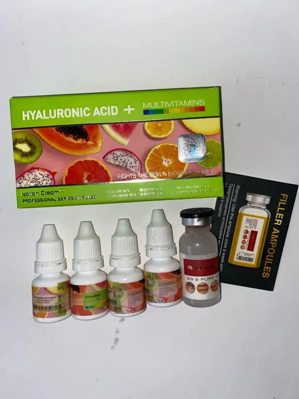 Hyaluronic Acid + Multivitamins Гиалуроновая кислота + поливитамины Ампулы профессиональной серии Борется с 7 признаками старения. Наполнители (Филлер) коллаген уже много лет пользуются популярностью в Восточной Азии, но они начинают получать признание во всем мире. Изготовлены из ткани, пропитанной гидролизованным наполнителем, коллагеном и другими антивозрастными ингредиентами, ампулы с медицинским наполнителем напоминают суперпродукт для лица. Используя их на регулярной основе, вы можете сделать свою кожу гладкой и эластичной, одновременно уменьшая признаки старения. Существует несколько способов увеличить выработку коллагена в коже, но одним из самых удобных и эффективных является использование медицинских ампул с филлерами. Применение продукта быстрое и легкое, но преимущества огромные. Преимущество продукта: Подтягивает в ьялу кожу Подтягивает растянутую кожу Излучает блеск Интенсивно увлажняет кожу Поддерживает молодость кожи снизить морщины Повышает эластичность и прочность кожи Ускоряет процесс обновления кожи Уменьшает линии беспокойства, установленные провисание лба Уменьшает провисание бровей, делая веки нависшими и тяжелыми. Уменьшает скопление жидкости в верхней части щек, образуя мешки. Уменьшает глубину морщин вокруг губ Химический состав: Наполнитель (Филлер) 18% Колаген 20% Ботокс 18% Биотин 3% Мультивитамины 7% Гиалуроновая кислота 34% Упаковка состоит из: 1 ампула с филлером 20 мл (ВЫКОРИСТОВАТЬ 1 РАЗ НАтный) Состав: Коллаген+наполнитель (филлер) - 51% Нитрат золота (24К) - 18% Витамин С, Е - 22% Омега-3 - 5% Гиалуроновая кислота - 4% 4 флакони по 30 мл Состав: Філер - 18% Колаген - 20% Мультивитамины - 7% Гиалуроновая кислота - 34% Ботокс - 18% Биотин - 3% Как использовать: Омойте кожу лосьоном. Аккуратно высушите кожу. Нанесите на кожу круговыми движениями и хорошо помассируйте. Залиште на шкірі мінімум на час. Желательно использовать средство на ночь. Предупреждение: Не использовать на коже с повышенной чувствительностью.