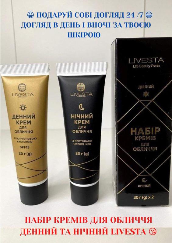 НАБІР КРЕМІВ ДЛЯ ОБЛИЧЧЯ ДЕНЬ/НІЧ Livesta 2х30 г✨ -Містять активні компоненти для зволоження шкіри обличчя -М'яка текстура -Приємний аромат Денний крем LIVESTA -Завдяки гіалуроновій кислоті з активними компонентами у складі відновлює та підтримує водний баланс шкіри. - SPF 15 надійно захищає обличчя від шкідливого впливу УФ-променів. Нічний крем LIVESTA -Стимулює процеси природного оновлення шкірного покриву впродовж усієї ночі. - Насичена гідролізатом чорної ікри формула крему чинить антивіковий ефект, глибоко живить, робить шкіру молодою та пружною