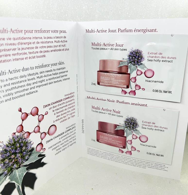 Крема для обличчя clarins multi active jour / nuit Цена 100грн при 2 крема по 2мл Clarinc multi active jour - Разглаживающий крем для сияния с солнцезащитным фактором SPF15 . Этот разглаживающий крем, усиливающий сияние, содержит новую технологию: • [Комплекс Skin Charger]: ниацинамид и экстракт морского эрингия образуют мощный дуэт, который помогает уменьшить первые видимые признаки старения. Усиливается барьерная функция кожи, возвращается сияние и сохраняется молодость. • Экстракт расторопши с ревитализирующими свойствами придает коже энергию. • Экстракт сунного дерева помогает улучшить текстуру кожи и уменьшить видимость пор. • Солнцезащитный фактор SPF15, который защищает кожу от вредного воздействия УФ лучей. Clarinc multi active nuit - Восстанавливающий разглаживающий ночной крем В течение дня кожа подвергается особому стрессу, поэтому ночь, во время отдыха, является идеальным временем для содействия ее обновлению. Этот восстанавливающий крем с 92% ингредиентов натурального происхождения содержит новую технологию: