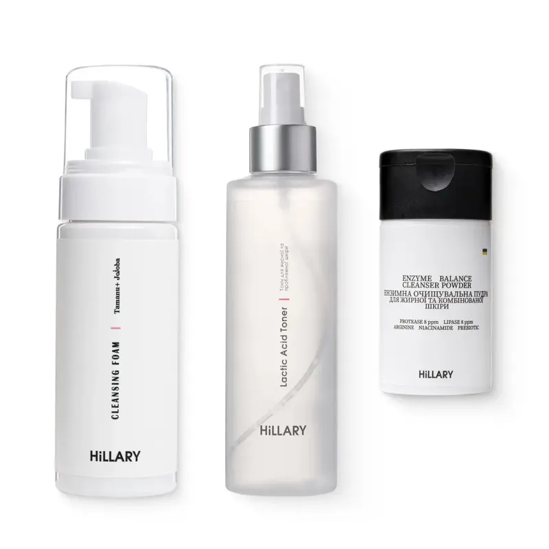 Этот набор разработан специально для подростков, которые сталкиваются с жирностью кожи, высыпаниями и неровным рельефом. Благодаря комплексному подходу, средства в наборе помогают очистить поры, нормализовать выработку себума, уменьшить воспаление и поддерживать здоровый микробиом кожи. Очищающая пенка для жирной и комбинированной кожи идеально подходит для ежедневного очищения, не нарушая естественный баланс кожи. Она эффективно удаляет загрязнения, обладает себорегулирующими свойствами, не забивает поры и помогает бороться с воспалениями. Масло тамана обладает мощными противовоспалительными и регенерирующими свойствами, нормализует деятельность сальных желез, защищает от внешних раздражителей. Масло жожоба – богатое витамином Е, увлажняет, регулирует выработку себума и способствует обновлению кожи. Энзимная очищающая пудра для жирной и комбинированной кожи – эффективное средство для глубокого очищения и выравнивания рельефа кожи. Растворяет избыточный себум, удаляет ороговевшие клетки, улучшает структуру кожи и уменьшает воспаление. Zymo Clear MD – энзимный комплекс, эффективно очищающий поры и уменьшающий жирность кожи. Аргинин регулирует выработку себума, уменьшает поры и улучшает эластичность кожи, а ниацинамид – оказывает антимикробное и противовоспалительное действие, помогает бороться с акне. Пребиотический комплекс BIOLIN P – поддерживает здоровый микробиом, уменьшает воспаление и раздражение. Тоник для жирной и проблемной кожи обладает увлажняющими, противовоспалительными свойствами, выравнивает текстуру кожи, регулирует выработку себума и предотвращает появление черных точек. Молочная кислота стимулирует выработку коллагена, мягко отшелушивает мертвые клетки, очищает поры, Sodium PCA помогает коже удерживать влагу, улучшает ее устойчивость к внешним воздействиям, а гиалуроновая кислота обеспечивает увлажнение и способствует быстрому заживлению кожи после высыпаний. В набор входят: Очищающая пенка для жирной и комбинированной кожи Hillary Cleansing Foam Tamanu + Jojoba oil, 150 мл; Энзимная очищающая пудра для жирной и комбинированной кожи HiLLARY Enzyme Balance Cleanser Powder, 40 г; Тоник для жирной и проблемной кожи Hillary Lactic Aсid Toner, 200 мл. Способ применения: 1. Нанести небольшое количество пенки на влажное лицо, помассировать несколько минут и тщательно смыть водой. 2. После очищения кожи нанести половину чайной ложки пудры на влажные руки и растереть до образования кремовой пенки. Нанести на обличчя круговими рухами, уникаючи зони навколо очей. Слегка помассировать 1-2 минуты, затем тщательно смыть теплой водой. Использовать пудру 2-3 раза в неделю. Энзимную пудру можно использовать для глубокого очищения кожи спины, где часто появляются акне и высыпания. Для этого небольшое количество пудры следует смешать с водой до получения кремообразной текстуры, нанести на влажную кожу спины, слегка помассировать и оставить на несколько минут для активного действия энзимов. Затем тщательно смыть водой. Регулярное применение помогает уменьшить количество высыпаний, выровнять текстуру кожи и уменьшить раздражение. 3. Нанести небольшое количество тоника на лицо с помощью ватного диска или безосенне распылить на лицо. Характеристики Наличие В наличии Назва Набор для подростков с проблемной кожей Hillary for teenagers with problematic skin Артикул для отображения 
