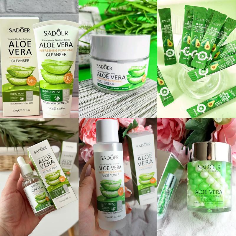 Sadoer 1.3воложуючий крем для обличчя 2.Сироватка для обличчя 3.Гель для вмивання 4. Відновлюючий крем для очей 5.Комплексна кислотна авокадо-очищувальна бульбашкова маска для обличчя 6. Тонер для обличчя