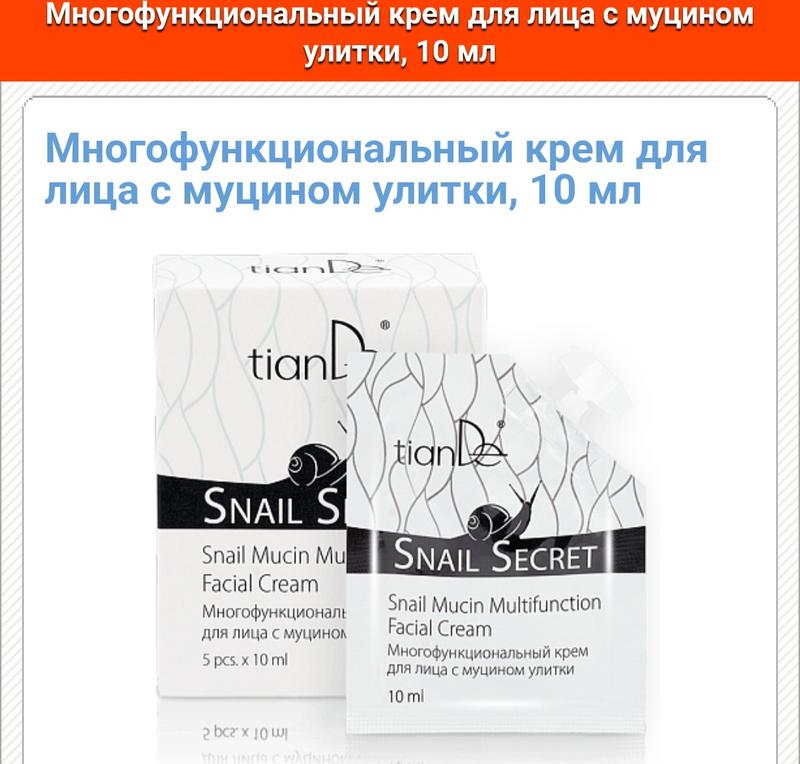 Молодость от ТианДе надо-о-о-лго! Муцин – чудодейственное средство, омолаживающее кожу изнутри. Слизь улитки запускает регенерационные процессы в дерме на клеточном уровне, оживляя и разглаживая кожу. Аналогов косметике с муцином по своей функциональности и эффективности в мире не существует. Сегодня весь мир знает, что секрет сохранения молодости заключается в использовании муцина. Это одно из самых эффективных средств замедлить процесс старения кожи, освежить и омолодить её. В состав муцина улитки входят: полисахариды – питают, запускают функцию обновления клеток; аминокислоты, пептиды – восстанавливают гидробаланс кожи; аллантоин – усиливает действие полисахаридов, регенерируя кожу; бактериофаги – обладают противовоспалительным действием, защищают кожу от попадания микробов, вирусов. Многофункциональный крем для лица с муцином улитки - активизирует процесс обновления клеток эпидермиса, способствует замедлению старения кожи. При регулярном использовании кожа становится ровной, исчезают мелкие морщины, образуется защитный барьер, препятствующий повреждениям и появлению раздражений. Результат применения многофункционального крема для лица с муцином улитки : кожа приобретает свежесть и сияние благодаря улиточному муцину, который одновременно воздействует на морщины, тургор и цвет лица; насыщенная живительной влагой - кожа разглаживается и становится упругой; под действием крема укрепляются защитные свойства кожи, к ней возвращается первозданная энергия и красота; день за днем кожа интенсивно восстанавливается и обновляется, словно заново рождаясь 5 индивидуальных пакетиков с удобными дозаторами Многофункциональный крем для лица с муцином улитки - активные компоненты крема обеспечивают эффективную корректировку несовершенств кожи, а вместе с тем – профилактику старения клеток. Многофункциональность улиточного муцина позволяет одновременно воздействовать на морщины, тургор и цвет лица, придавая коже свежесть и сияние. Глубокое увлажнение моментально повышает упругость кожи, она разглаживается и приобретает ощущение комфорта. День за днем кожа интенсивно восстанавливается и обновляется, словно заново рождаясь.