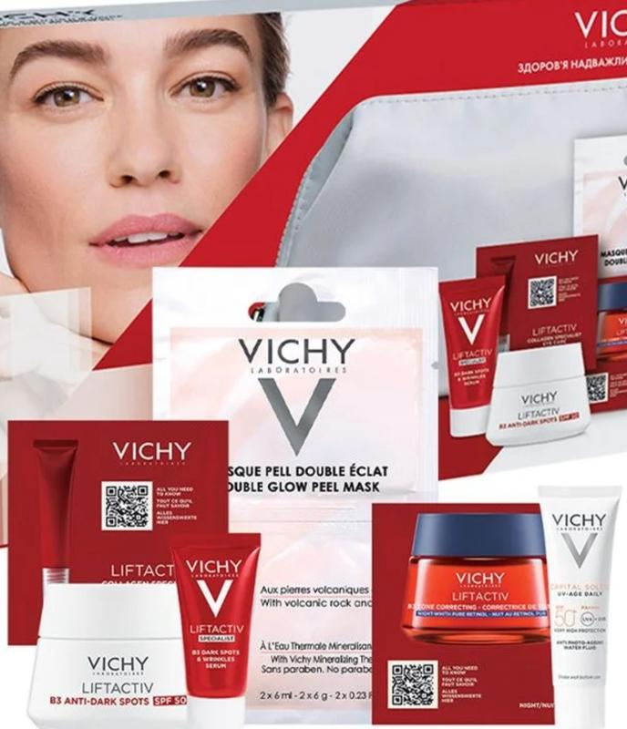 В набор входит: 1) Минеральная маска-пилинг для лица, 2*6 мл. Она содержит фруктовые кислоты и вулканические частицы, которые мягко отшелушивают отмершие клетки и очищают кожу, возвращая ей свежесть и сияние. 2) Антивозрастной крем Liftactiv В3, 15 мл. Крем с ниацинамидом, пептидами и SPF 50 эффективно корректирует пигментные пятна и морщины, защищает кожу от UV-излучения. 3) Сыворотка Liftactiv Specialist B3, 5 мл. Продукт имеет гипоаллергенную формулу с ниацинамидом, гликолевой кислотой, благодаря которой уменьшает видимость пигментных пятен и морщин, улучшает тон и текстуру кожи. 4) Солнцезащитный флюид Capital Soleil UV-Age Daily, 3 мл. Средство обеспечивает защиту от UVA- и UVB-лучей, борется с признаками фотостарения. Флюид не оставляет белых следов. 5) Крем для кожи вокруг глаз Liftactiv Collagen Specialist, 1,5 мл. Крем с пептидами, ниацинамидом уменьшает морщины, темные круги, мешки под глазами и другие признаки старения. 6) Ночной крем Liftactiv B3, 1 мл. Интенсивное средство с ретинолом и ниацинамидом восстанавливает кожу, делая ее более ровной и сияющей. + Косметичка