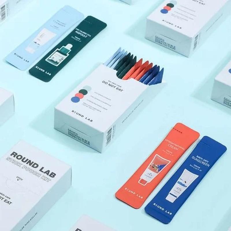 OUND LAB Stick Pouch Kit — сет мініверсій продуктів-бестселерів бренду. Включає 4 позиції: ніжну пінку для умивання з морською водою ROUND LAB 1025 Dokdo Cleanser, 3 шт*3 мл; концентровану сироватку з екстрактами голок сосни та центелли ROUND LAB Pine Calming Cica Ampoule, 3 шт*3 мл; бар’єрний крем з екстрактом соєвих бобів та пантенолом ROUND LAB Soybean Panthenol Cream, 3 шт*3 мл; зволожувальний сонцезахисний крем з березовим соком ROUND LAB Birch Juice Moisturizing Sunscreen, 3 шт*3 мл.