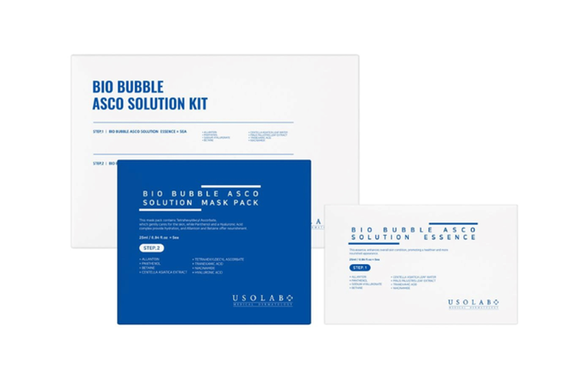 Карбоксітерапія 2-в-1 з ефектом кисневого ліфтингу Usolab Bio Bubble Asco Solution 1 процедура Професійний двоетапний догляд, що замінить салонну процедуру будинку. Глибоко зволожує, освітлює та відновлює шкіру вже після першого застосування. Що входить до комплекту: 1. Есенція (Step 1) Прозора формула, насичена гіалуроновою кислотою, ніацинамідом та рослинними екстрактами. Зволожує, знімає подразнення, готує шкіру. 2. Маска (Step 2) Просочена активною есенцією. При контакті зі шкірою та киснем формує мікро-бульбашки. Вони допомагають компонентам проникнути глибше та активізувати відновлення.