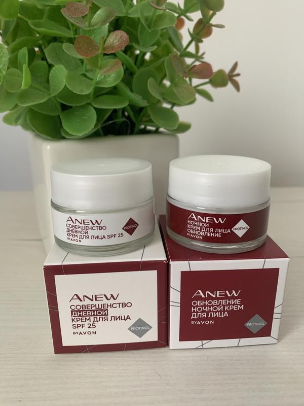 Набір кремів Чудова якість Сроки вийшли до 03.2024 року Денний крем 15 мл Відновлювальний денний крем бренда Avon чинить комплексну дію: захищає від сонячних променів, ретельно зволожує, попереджає виникнення зморшок. До складу входить запатентований комплекс Protinol, що підтримує синтез колагену, завдяки чому підвищується тургор. Інноваційна технологія значно зменшує перші ознаки старіння шкіри. Регулярне застосування денного крему поліпшить гладкість, забезпечить необхідний рівень вологи для краси і сяйво молодості вашої шкіри! :rose:Особливості Anew Reversalist Day With Protinol Cream SPF 25 від бренда Avon: - SPF 25 захищає шкіру від впливу ультрафіолету; - поліпшує еластичність епідермісу; - Protinol виштовхує зморшки зсередини і відновлює пружність шкіри; - висока ефективність підтверджена клінічними випробуваннями; - рекомендується застосовувати після 35 років; - захищає від фотостаріння; - надає природне сяйво; - швидко всотується, не залишаючи липкої плівки на поверхні. Нічний крем 15 мл Призначення: від зморшок, відновлення, від перших ознак старіння, зволоження, зміцнення, розгладження Об'єм: 15ml, Інгредієнти: ретинол Час застосування: нічний Стать: для жінок Колаген – це білок, який наші клітини епідермісу здатні виробляти самостійно. Саме він підтримує тонус шкіри і не дає їй обзавестися зморшками. Щоб налагодити процес його вироблення, який значно сповільнюється з часом, скористайтеся Anew Reversalist Night Revitalising Cream With Protinol бренда Avon. Цей продукт діє на основі формули, що містить амінокислоту Protinol. Продукт забезпечить повноцінний догляд, додасть шкірі гладкість, шовковистість і повноцінний комфорт. Особливості Anew Reversalist Night Revitalising Cream With Protinol Avon: - розгладжує зморшки і вирівнює мікрорельєф шкірного покриву; - має приємний аромат і ніжну консистенцію; - активізує вироблення колагену в клітинах епідермісу;