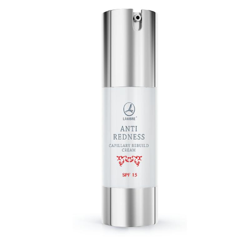 Ваша кожа резко и агрессивно реагирует на перепады температуры, физические нагрузки и солнце? Покраснения, сосудистые сеточки, зуд и дискомфорт просто невыносимы и преследуют Вас? Острая и горячая пища вызывают мгновенное покраснение кожи? На 99% вероятности Вы обладательница гиперчувствительной кожи с куперозными проявлениями. Такая кожа требует особого трепетного и постоянного ухода, направленного в первую очередь на укрепление хрупких стенок кровеносных сосудов, успокоению и снятию раздражения, устранению покраснений и выравниванию цвета кожи. Экспертные лаборатории компании LAMBRE разработали ANTI RENDESS CAPILLARY REBUILD CREAM, укрепляющий крем для ежедневного ухода за лицом для чувствительной кожи с сосудистыми проявлениями, склонной к покраснениям. Богатая формула, основанная на инновационном ингредиенте REDYLESS®, укрепляет кровеносные сосуды, уменьшает покраснения и противодействует неблагоприятному влиянию внешних факторов. Система фильтров UVA и UVB SPF 15 помогает защитить кожу от вредного UV-излучения, а зеленый пигмент скрывает покраснения и выравнивает тон кожи. Регулярное использование крема обеспечивает коже ощущение комфорта, увлажнение и питание. Результат комплексного воздействия крема LAMBRE ANTI RENDESS CAPILLARY REBUILD CREAM * укрепляет и уплотняет хрупкие кровеносные сосуды; * эффективно предотвращает разрыв кровеносных сосудов, препятствует возникновению новых «паучков»; * успокаивает раздражения, уменьшает покраснения кожи; * оптимально увлажняет и интенсивно регенерирует кожу; * уменьшает заметность «паучков» и покраснений; * улучшает цвет кожи. Средняя защита от излучения UVA/UVB и IR --- SPF15 БЕЗ парабенов --- БЕЗ аллергенов --- БЕЗ ГМО --- БЕЗ парафинового масла и силиконов Активные ингредиенты натурального и биотехнологического происхождения