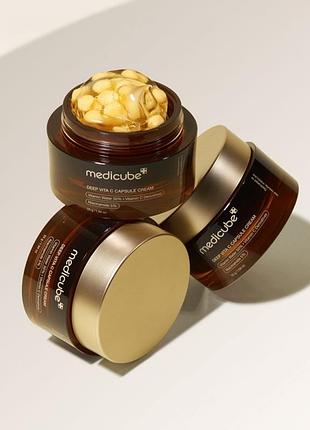 Оригінал!!! Medicube - Deep Vita C Capsule Cream Крем для обличчя з освітлювальним ефектом Medicube - Deep Vita C Capsule Cream - крем для щоденного догляду за обличчям у формі капсул, занурених у гель. Гідролат обліпихи, що входить до складу, покращує тон шкіри, заспокоює подразнення і запалення. Водночас ніацинамід зміцнює шкіру, нейтралізує шкідливий вплив вільних радикалів і освітлює пігментацію. Альфа-арбутин разом з вітаміном С і 5 його похідними ефективно освітлює шкіру. Наостанок глюконолактон покращує рівень зволоження шкіри та підсилює зміцнювальну дію крему. Активні компоненти: гідролат обліпихи - сприяє регенерації шкіри, заспокоює подразнення та запалення, ніацинамід 5% - має антиоксидантну та зміцнювальну дію, вирівнює тон шкіри, освітлює пігментні плями, підтримує ліпідний бар'єр, регулює виділення себуму, звужує пори, вітамін С та 5 його похідних - нейрталізують шкідливий вплив вільних радикалів, стимулюють синтез колагену, мають зміцнювальні, освітлювальні та антивікові властивості, глюконолактон - PHA, підвищує рівень зволоження шкіри, надає пружності, усуває вільні радикали, зміцнює епідермальний бар'єр, альфа-арбутин - освітлює шкіру, зменшує пігментацію, вирівнює тон, має антиоксидантні властивості. Дія засобу: зміцнює, освітлює, зменшує пігментацію, вирівнює тон шкіри, має антиоксидантну дію, заспокоює, зволожує.
