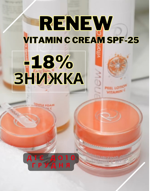 Крем-антиоксидант с активным витамином С SPF-25 🍊Moisturizing Cream Vitamin C SPF-25 Renew 😊 Продукты серии с активным витамином С предназначены для пациентов с тусклой и уставшей кожей, которые придают сильную антиоксидантное действие, восстанавливают гидробаланс и эластичность кожи, выравнивают цвет лица, а также способствуют профилактике и коррекции возрастных изменений кожи 💦Нежный, увлажняющий крем с приятным цитрусовым ароматом быстро впитывается, не оставляя ощущения жирности на лице 🎁 АКЦИОННАЯ ПРОПОЗИЦИЯ до 10 ГРУДНЯ 18%🎁 📍Цена на крем в объявлении указана по 5мл/140грн-18%=115грн в подоле Подол⚖️ 15мл / 420грн-18%=344грн 30мл/760грн -18%=622грн 50мл/1155грн-18%=947грн Целый формат💰 50мл/2680гр-18%=2198грн ☝ https://shafa.ua/uk/my/reviews Приглашаю перейти по усиливанию на шкафу в раздел отзывы и узнать о моей работе с заказами 🌾Подписывайся на мою страницу и одержи информацию о акцийх и персональных предложениях! Свойства ✔️роскошный крем богат антиоксидантами обеспечивает восстанавливающую защиту и способствует естественное омоложение кожи ✔️содержит высокую концентрацию витамина-С (6%) в стабильной жирорастворимой форме, который есть мощным антиоксидантом, повышает иммунитет кожи и укрепляет стенки кровеносных сосудов ✔️формула обладает сильными омолаживающими свойствами, уменьшая появление тонких линий, морщин, неровного тона кожи и пигментных пятен ✔️благодаря своему пролонгированным действиям и высокому фактору SPF защиты, эффективно защищает кожу от воздействия солнечного излучения в дневное время 👩Применение Небольшое количество крема нанести на предварительно очищенную кожу и распределить легкими массажными рухами Дневной крем для ежедневного использования 🍊🌱🍋Активные компоненты Бисаболол Д-пантенол Экстракт лимона Uvinul® A Plus Tinosorb® S Вітамін С (Аскорбіл тетраізопальмітат) ⭐️RENEW - Израиль Заказывайте в Direct📩