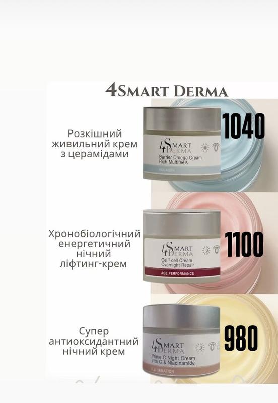 ✨ 4Smart Derma — КРЕМИ, ЯКІ ПРАЦЮЮТЬ, ПОКИ ТИ ВІДПОЧИВАЄШ ✨ Професійний догляд, що відновлює, живить та омолоджує шкіру вже з перших днів використання. 💎 Розкішний живильний крем з церамідами — 1040 грн Відновлює бар’єр, знімає сухість, робить шкіру щільною та гладенькою. Ідеальний для чутливої та зневодненої шкіри. 🌙 Хронобіологічний енергетичний нічний ліфтинг-крем — 1100 грн Працює синхронно з біоритмами шкіри. Ліфтинг, пружність, оновлення клітин — ефект «відпочившого обличчя» зранку. 🍋 Супер антиоксидантний нічний крем (Вітамін C + Ніацинамід) — 980 грн Освітлює, вирівнює тон, бореться з тьмяністю та пігментацією. Сяйво та гладкість уже після кількох застосувань. 💛 Професійна косметика, яка підходить для щоденного догляду вдома.