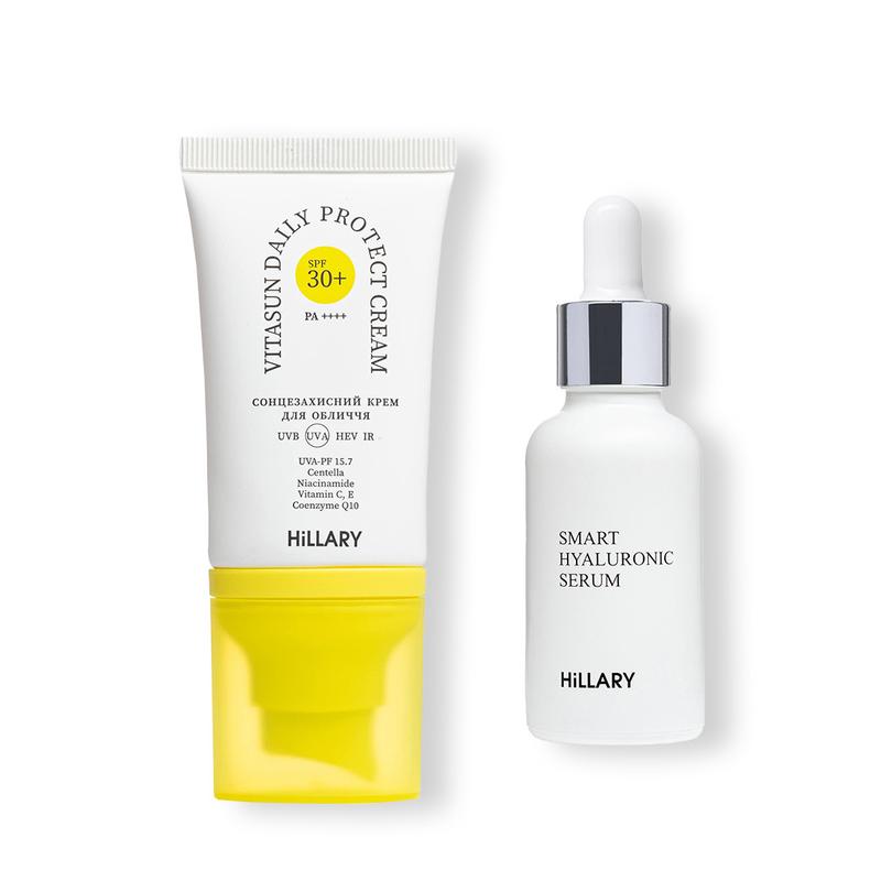 Догляд за шкірою обличчя для чоловіків - Must have у сучасних умовах життя. Чоловіча шкіра дуже страждає від забруднень, потовиділення і жорсткої води. Догляд за обличчям для чоловіків така ж необхідність, як щоденне гоління і умивання. Потужний вплив тютюну, алкоголю, сонця, щоденна процедура гоління, використання спиртових лосьйонів і пінок для гоління залишають зморшки і роблячи шкіру чутливою, а велика кількість шкірного сала на шкірі у чоловіків провокує жирний блиск і появу вугрів. Шкіра чоловіків більш пружна і щільна, завдяки 2 природним бонусам - тестостерону і колагену. Але догляд за шкірою не сильно відрізняється від жіночого. Ми підготували універсальні засоби для щоденного догляду за шкірою обличчя чоловіків. Санскрін для щоденного використання з потужним захистом від UVA, UVB, HEV та IR випромінювання. Мікс фільтрів останнього покоління Uvinul A plus B та Tinosorb М забезпечує потужний захист шкіри від сонця в умовах міста, адже працює при нанесенні у невеликих кількостях та не вимагає поновлення протягом дня та служить чудовою базою для макіяжу. Екстракти паростків соняшнику та насіння дерева тара протидіють негативному впливу на шкіру синього (HEV) та інфрачервоного світла (IR), зберігають структурний колаген для пружності шкіри. Гіалуронова сироватка Smart у комбінації утворює на шкірі найтоншу плівку, яка активно вбирає вологу з навколишнього середовища, зберігаючи її в роговому шарі, забезпечує поверхневе зволоження шкіри і одночасно встановлює захисний бар'єр. Гіалуронова сироватка є відмінним засобом для пошкодженої шкіри, захищаючи її в той час, поки йдуть відновлювальні процеси. До набору входять: - Сонцезахисний крем для обличчя SPF 30+ Hillary VitaSun Daily Protect Cream, 40 мл - Гіалуронова сироватка Hillary Smart Hyaluronic, 30 мл. Спосіб застосування: 1. Невелику кількість гіалуронової сироватки потрібно нанести масажними рухами на чисту, вологу шкіру обличчя, шию і зону декольте. Використовуйте щодня, вранці (в тому числі і як активний засіб під денний крем) і ввечері. 2. Нанесіть невелику кількість крему на шкіру обличчя після повного вбирання попередньо нанесених засобів.