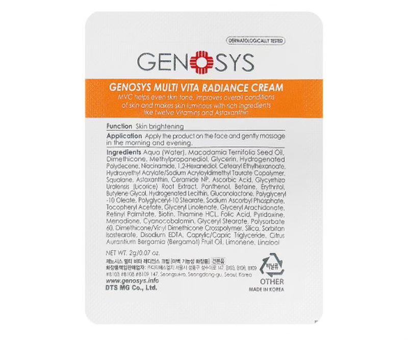 Особливості Genosys Multi Vita Radiance Cream: - мультивітамінний склад; - багатокомпонентний комплекс доповнений астаксантином, що відповідає за гарний блиск шкірного покриву; - мінімізує вираженість пігментації; - забезпечує антиоксидантний ефект; - збагачений екстрактом кореня солодки, який блокує синтез тирозинази і завдяки цьому помітно вирівнює тон шкіри; - містить олію горіха макадамії; - містить пальмітолеїнову кислоту та фітостерини - заспокоєння запаленого шкірного покриву та боротьба з почервоніннями; - завдяки кераміду NP чинить зволожувальний вплив (збереження оптимального гідробалансу протягом тривалого часу),