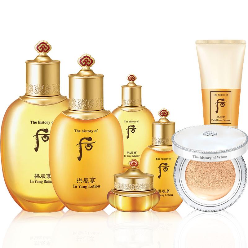 Мы подтверждаем, что все продукты, предлагаемые для продажи на нашей платформе, поступают непосредственно от авторизованных дистрибьюторов настоящих корейских косметических брендов. Наша приверженность подлинности гарантирует, что каждый продукт, который Вы покупаете, будет подлинным и высочайшего качества. Видеопрезентация The History of Whoo Gongjinhyang 3pcs Special Set 304 ml +13 g Набор состоит из: 1. The History of Whoo Gongjinhyang Essential Moisturizing Balancer/Тонер 150 ml 2. The History of Whoo Gongjinhyang Essential Nourishing Lotion/Эмульсия 110 ml 3. The History of Whoo Gongjinhyang Intensive Nutritive Cream/Крем 4 ml 4. The History of Whoo Gongjinhyang Essential Moisturizing Balancer/Тонер 20 ml 5. The History of Whoo Gongjinhyang Essential Nourishing Lotion/Эмульсия 20 ml 6. The History of Whoo Gongjinhyang Facial Foam Cleanser/Пенка 40 ml 7. The History of Whoo Gongjinhyang Radiant White Moisture Cushion Foundation #21/Тональный крем светло-бежевый 13 g Косметика премиум класса The History of Whoo Gongjinhyang представляет собой набор косметических средств по базовому уходу лица. Линия Qi & Jin является превосходной как для молодых девушек, так и женщин постарше, целевая аудитория 20-40 лет или сухая кожа в любом возрасте. Средства линии Qi & Jin защищают клетки от повреждений, вызванных оксидативным влиянием, усиливают их регенеративные способности в условиях стресса, восстанавливают гидролипидную пленку, защищают кожу от обезвоживания и внешних агрессивных воздействий (солнце, бактерии и т.д.). Состоит из компонентов, которые восстанавливают, защищают кожу от обезвоживания, борются с преждевременным ее старением. Благодаря мощной смеси питательных и увлажняющих ингредиентов, включая комплекс GongJinBiDan, polygonatum officinale, женьшень, кордицепс, спаржу и акантопанакс, линия The History of Whoo Gongjinhyang улучшает кровообращение и эластичность кожи, снижает ее чувствительность к отрицательным факторам окружающей среды. Обогащенная ферментированным женьшенем и грибом кордицепса для максимального эффекта, комплекс GongJinBiDan (основанный на эзотерической формуле императорского двора в древней Корее) является идеальным ингредиентом для увлажнения, питания и придания упругости коже лица. Медитативный ориентальный аромат косметических средств этой линии со специальной кислинкой создают настроение и умиротворение. Роскошная текстура и гладкая кожа под пальцами - это чувство глубокого ухода на клеточном уровне. Кожа становится ухоженной, подтянутой, отдохнувшей, приобретает здоровый вид, восстанавливается природный цвет лица. Тонер Essential Moisturizing Balancer обогащен корейскими экстрактами травяных ингредиентов, успешно борющихся с признаками старения кожи. Уменьшает появления морщин. Восстанавливающая формула балансера мгновенно впитывается кожей, обеспечивая ей мягкий и насыщенный уход. Повышает эффективность последующих средств по уходу за кожей лица. Богатая питательными веществами эмульсия Essential Nourishing Lotion успокаивает кожу, заметно уменьшает тонкие линии и морщины. Создана на основе экстракта дикого женьшеня, усиливающего защиту кожи от повреждений, омолаживает ее, сохраняет чистой и здоровой. Крем для лица Gongjinhyang Intensive Nutritive Cream омолаживает кожу, делает ее более упругой и эластичной. Глубоко проникая в слои эпидермиса, оздоравливает ее изнутри, уменьшает появление тонких линий и морщин, создает здоровый, ухоженный и подтянутый вид. Тональный крем в кушоне Gongjinhyang Radiant White Moisture Cushion Foundation обогащенный экстрактом хризантемы, обеспечивает оптимальное увлажнение, насыщение и охлаждение кожи, сохр