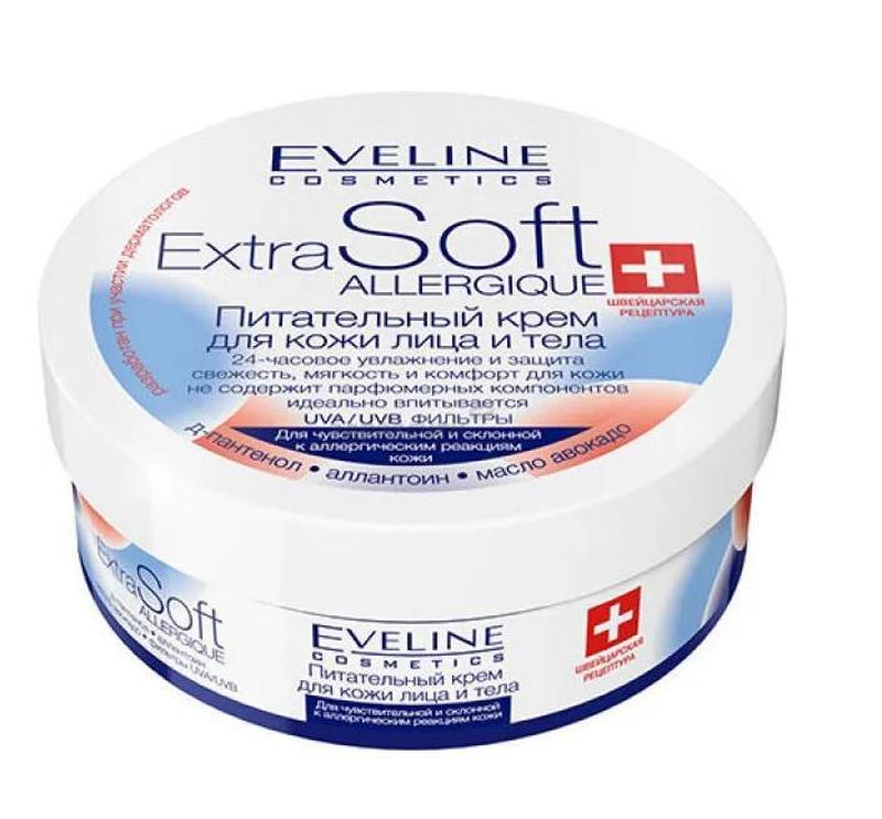Крем для лица и тела Extra Soft 200 мл. Eveline Питательный для чувствительной кожи Эвелин Для любого типа кожи. Продолжительная защита и интенсивный уход. Питательный крем - результат применения швейцарской рецептуры, отличающийся богатым набором ценнейших качеств: превосходно впитывается, интенсивно увлажняет и успокаивает. Уже после первого применения создает ощущение комфорта, придавая коже лица и тела не только мягкость и свежесть, но и нежный, очень приятный аромат. - Масло авокадо - подобно натуральным липидам предохраняет кожу от пересушивания, потери влаги и упругости; питает и основательно регенерирует.- Д-пантенол + Аллантоин - нормализуют процесс восстановления клеток кожи, оказывают успокаивающее и противовоспалительное действие. Интенсивно увлажняют. СПОСОБ ПРИМЕНЕНИЯ: ежедневно наносить на кожу лица и тела для поддержания эластичности, мягкости и оптимального увлажнения.