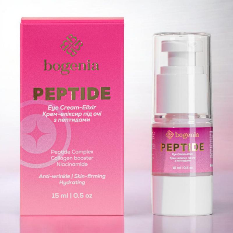 Крем-эликсир для кожи вокруг глаз Bogenia Eye Cream Elixir с пептидами 15 мл Крем-эликсир Bogenia с пептидами - это мощное средство по уходу за нежной зоной под глазами. Он помогает уменьшить морщины, повысить упругость, интенсивно питает и увлажняет кожу, поворачивая ей свежий и сияющий вид. Благодаря сочетанию пептидов, ниацинамида и коллагенового бустера формула работает как омолаживающая сыворотка, активизируя естественные процессы восстановления. Основные действия: - смягчает выраженность мимических морщин; - делает кожу более плотной и упругой; - уменьшает темные круги и следы усталости; - поддерживает оптимальный уровень увлажнения; - выравнивает текстуру кожи и делает ее гладкой. Активные компоненты: - пептидный комплекс - стимулирует выработку коллагена и повышает тонус; - коллагеновый бустер - укрепляет структуру кожи и улучшает эластичность; - ниацинамид (B3) - выравнивает тон, укрепляет защитный барьер и замедляет проявления старения. Достоинства: - обеспечивает эффект «свежего взгляда» уже после нескольких применений; - легкая текстура быстро впитывается и не оставляет липкости; - отлично подходит как основа под макияж; - удобный дозатор гарантирует гигиеническое и экономное использование. Способ применения: Нанесите маленькое количество крема на очищенную кожу вокруг глаз, аккуратненько вбивая подушечками пальцев. Используйте дважды в день - утром и вечером. Объем: 15 мл, флакон с дозатором.