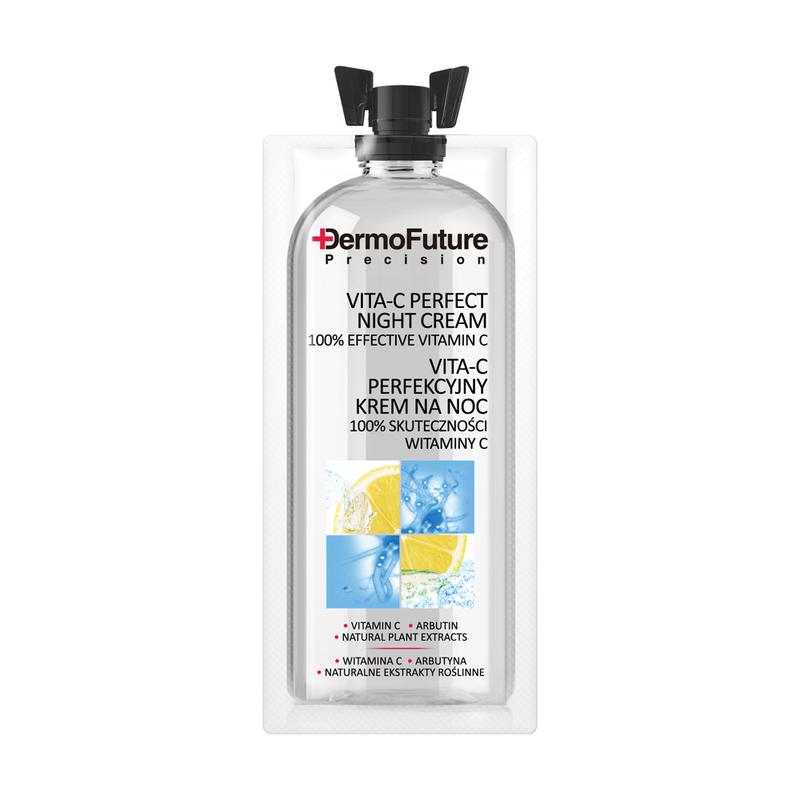 Нічний крем DermoFuture збагачений вітаміном С, завдяки чому він уповільнює синтез меланіну, в такий спосіб освітлюючи шкіру. Багатий активними компонентами склад крему має антивікові, антиоксидантні та захисні властивості, бореться з вільними радикалами. Арбутин освітлює шкіру, вирівнює її тон і робить сяючою, свіжою та гладенькою. Унікальна формула крему містить натуральні рослинні екстракти, які забезпечують максимальне зволоження та живлення протягом усієї ночі. Результат від використання: • освітлений та вирівняний тон шкіри• зменшення пігментації• ефективне зволоження та живлення• антиоксидантний ефект• антивіковий ефектНе містить шкідливих для здоров’я речовин.