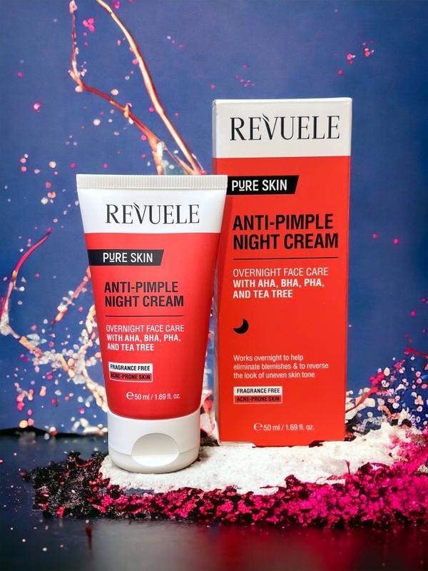 ### Нічний крем для обличчя REVUELE ANTI-PIMPLE NIGHT CREAM призначений для жирної та комбінованої шкіри, схильної до акне. Потужна формула з AHA, BHA, PHA та чайним деревом діє протягом ночі, підтримуючи процес оновлення клітин, допомагає регулювати вироблення шкірного сала та запобігає появі недосконалостей. М'яко відлущуючи, допомагає виправити постакне, вирівнює тон шкіри та звужує пори. Спосіб застосування: наносити ввечері на чисту суху шкіру обличчя та шиї, уникаючи області навколо очей. Ніжно масажуйте до повного вбирання. Увага: можлива індивідуальна непереносимість будь-якого з інгредієнтів. Перед першим використанням проведіть тест на чутливість. Уникайте контакту з очима. У разі потрапляння продукту в очі негайно промийте їх великою кількістю води. ###