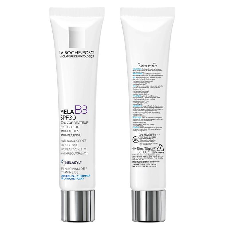 La Roche-Posay Mela B3 SPF30 - это высокоэффективный крем для осветления и защиты кожи, специально разработанный для борьбы с пигментацией, неровным тоном и следами постакне. Благодаря сочетанию передовых дерматологических компонентов, средство работает комплексно, улучшая внешний вид кожи и укрепляя ее естественный барьер. В составе крема содержится 10% ниацинамида (витамин В3), который помогает осветить пигментные пятна, успокаивает кожу и выравнивает тон. Мелассил -- активный запатентованный комплекс, оказывающий непосредственное влияние на синтез меланина, помогая уменьшить интенсивность уже имеющихся пятен и предотвратить появление новых. Салициловая кислота мягко отшелушивает кожу, улучшает ее текстуру и способствует обновлению клеток. Дополнительная защита обеспечивает SPF30 с широким спектром действия против UVA и UVB-лучей, что является важным фактором в профилактике фотостарения и создания новой пигментации. Крем имеет легкую нежирную текстуру, быстро впитывается, не оставляет белого налета и может использоваться в качестве дневного ухода под макияж. La Roche-Posay Mela B3 подходит для всех типов кожи, включая чувствительную. Формула протестирована дерматологами, не содержит парабенов и аллергенных ароматизаторов. Результатом регулярного применения становится более ровный, сияющий тон кожи, уменьшение пигментных пятен и гладкая текстура лица. Объем: 40 мл Тип кожи: все типы, включая чувствительную Страна производитель: Франция Время применения - дневной уход