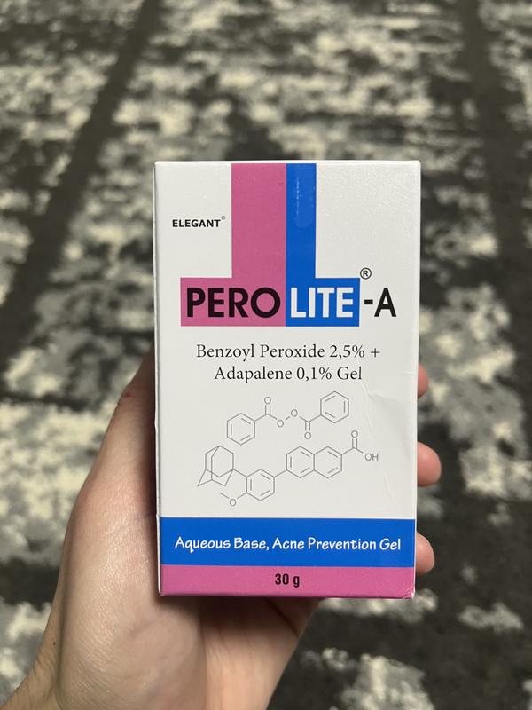 Гель від акне ПЕРОЛАЙТ-А / PEROLITE-A - це гелева формула для шкіри, схильної до акне. Містить перекис бензоїлу і адапален, які ефективно зменшують і контролюють бактеріальне забруднення. Він може зменшити кількість і тяжкість акне і сприяти швидкому загоєнню прищів. ЗАСТЕРЕЖЕННЯ ПРИ ЗАСТОСУВАННІ Гель ПЕРОЛАЙТ-А / PEROLITE-A призначений тільки для зовнішнього застосування. Не допускайте попадання гелю PEROLITE-A в очі, ніс, рот і не ковтайте гель. Якщо ви застосували гель PEROLITE-A в цих місцях, промийте їх великою кількістю води. Мінімізуйте вплив ультрафіолетового світла; використовуйте сонцезахисний крем і захисний одяг. Не наносіть гель на садна і порізи, а також на екзематозну або обгорілу на сонці шкіру. Якщо відбувається подразнення шкіри, необхідно нанести зволожуючий крем або зменшити частоту нанесення гелю. Не обробляйте ділянки шкіри, на яких застосовуєте гель PEROLITE-A, воском, не застосовуйте місцеві засоби, які можуть додатково подразнювати шкіру (наприклад, в’яжучі речовини, абразивні мила та миючі засоби, відлущувачі, сірку, резорцин, саліцилову кислоту). Не застосовуйте засіб, якщо у вас: Підвищена чутливість до адапалену або інших компонентів Печінкова або ниркова недостатність Гіперліпідемія Не рекомендовано застосовувати вагітним, жінкам, які планують вагітність, і годуючим жінкам, а також дітям до 12 років.