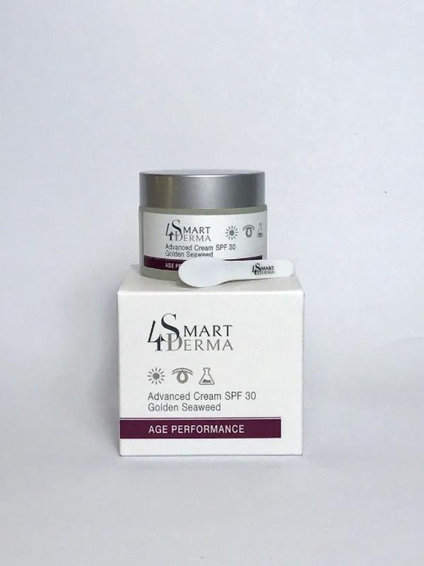 Передовий денний крем SPF 30 «Золоті водорості» Smart4Derma Age Performance 50 мл Надсучасний антиоксидантний захисний крем забезпечить миттєве зволоження, гладкість і пружність шкірі. Завдяки унікальному екстракту водоростей з глибин Середземного моря, препарат кардинальним чином збільшує кількість глікозаміногліканів у тканинах. Пептидний комплекс запускає процес дермо- епідермальної реструктуризації за допомогою особливої клітинної комунікації (Cell2Cell) для ефективної боротьби з основними ознаками старіння. Призначення - Щоденний безперервний режим догляду за шкірою для уповільнення старіння без радикальних заходів. - Запобігання появі динамічних та статичних зморшок. - Фото- тахроностаріння. - Тьмяний колір обличчя. - Догляд за шкірою після використання інвазивних методик, контурної пластики, пластичної хірургії. - Гіперпегментація. - Знижений тонус шкіри. - Вікова шкіра.