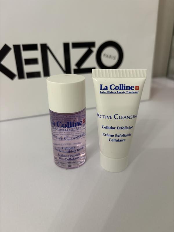 Ціна за набір, крем 15 мл, тонік Клітинний біорозгладжуючий тонік (Cellular Bio-Smoothing Tonic). Він зволожує, тонізує шкіру, вирівнює її текстуру та уповільнює процеси старіння. Праворуч: Клітинний ексфоліатор (Cellular Exfoliator). Це відлущуючий крем з мікрочастинками морського походження та екстрактами алое вера і мальви, який видаляє ороговілі клітини, забруднення, вирівнює тон та текстуру шкіри.