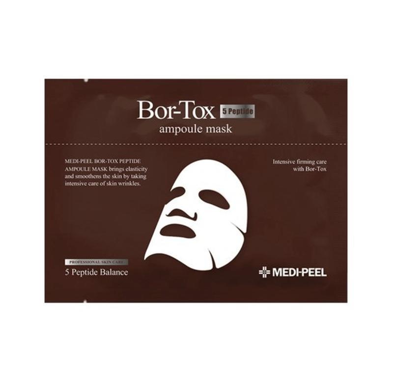 Ампульная лифтинг-маска с пептидным комплексом MEDI-PEEL Bor-Tox Peptide Ampoule Mask для активного омоложения кожи. MEDI-PEEL Bor-Tox Peptide Ampoule Mask: - эффективно восстанавливает упругость и эластичность тканей, - способствует уменьшению глубины морщин, - подтягивает и укрепляет тургор кожи, - улучшает цвет лица, - борется с тусклостью, сухостью и смягчает поверхность эпидермиса. В составе: Volufiline -- это современный актив, работающий в глубоких слоях кожи без инъекций. Он представляет из себя комбинацию гидрогенизированного полиизобутилена, синтетического масла и экстракта корня растения anemarrhenae asphodeloides. Именно экстракт этого корня эффективно стимулирует адипоциты, клетки, из которых, в основном, состоит жировая ткань. Стимулирует образование липидов в жировых клетках (адипоцитах), регулирует процесс их отложения, а также активизирует микроциркуляцию крови. Гиалуроновая кислота проникает глубоко в эпидермис и призвана устранить дегидратацию кожи, восполнить недостаток влаги, устранить сухость и защищать от старения кожи. Комплекс из 5-ти видов пептидов увеличивают упругость и эластичность кожи, ускоряют процессы выработки организмом собственных волокон коллагена и эластина. Уменьшают глубину морщин и препятствуют обвисанию кожи. Укрепляют защитный барьер кожного покрова. Благодаря составу маска укрепляет и подтягивает кожу, обеспечивает обильное питание благодаря запатентованному растительному комплексу. Увлажняет и укрепляет кожный барьер. Применение: После очищения используйте тонер, далее аккуратно нанесите маску на лицо. Снимите маску через 10 ~ 20 минут. Аккуратно промокните оставшуюся эссенцию, оставшуюся на вашей коже.