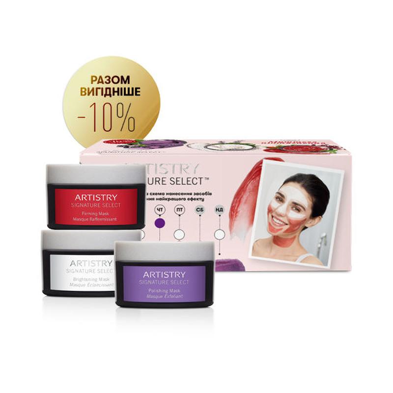 Artistry Signature Select Набір масок «Миттєве підтягнення» У наборі: Освітлювальна маска для шкіри обличчя Artistry Signature Select ™. Маска для підтягнення шкіри обличчя Artistry Signature Select ™. Відлущувальна маска для шкіри обличчя Artistry Signature Select ™.