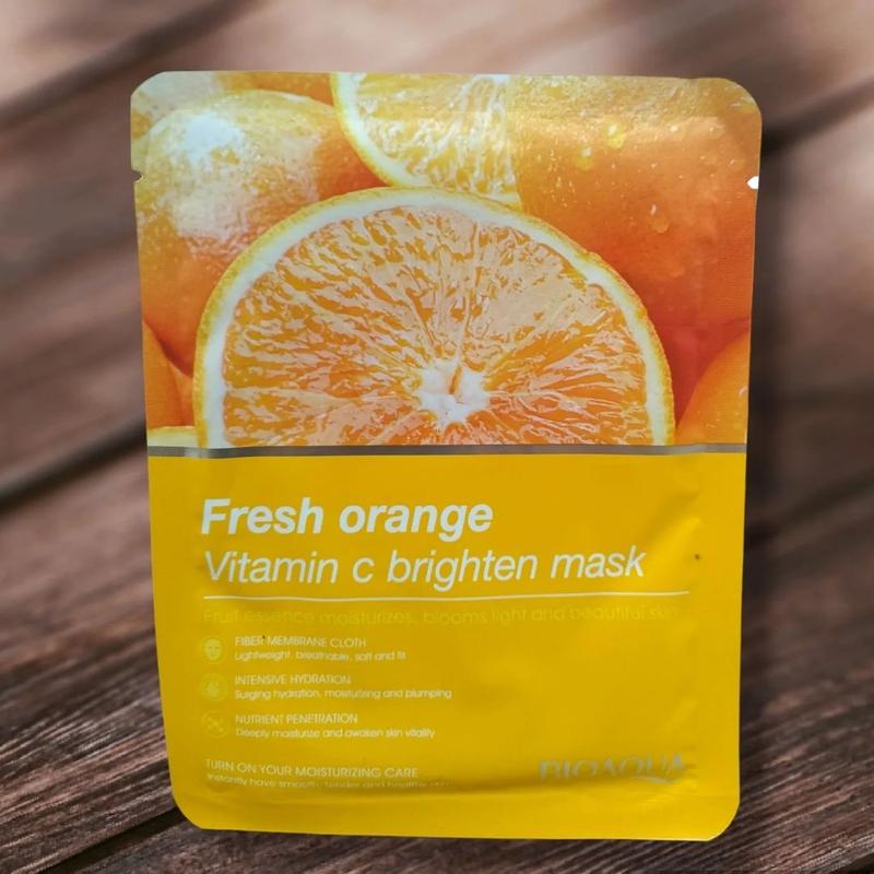 Маска для обличчя з екстрактом апельсина Bioaqua Fresh Orange Vitamin C Brighten Mask. Прекрасним доповненням догляду за шкірою обличчя є вітамінна маска від фірми Bioaqua. Косметичний засіб дбайливо освітлює шкіру, створює захисний бар'єр від негативних впливів навколишнього середовища та насичує епідерміс корисними вітамінами. Маска сприяє нейтралізації вільних радикалів, бореться з передчасним старінням та в'яненням шкірного покриву. Підсилює мікроциркуляцію крові, стимулює регенерацію та прибирає сліди запальних висипів. Косметичний засіб активно бореться з пігментацією, вирівнює рельєф, зволожує шкіру та покращує загальний стан шкірного покриву. Регулярне застосування косметичної маски в процедурах догляду, чудово освітлює і покращує колір вашого обличчя, прибирає дрібні дефекти і надовго збереже свіжість, чистоту і природну красу шкіри вашого обличчя. Застосування: Дістаньте маску з упаковки, розправте та покладіть на обличчя. Залиште на 20 хвилин. Зніміть маску, залишки не видаляйте, дайте їм впитатися.