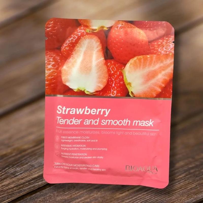 Маска для обличчя з екстрактом полуниці Bioaqua Strawberry Tender And Smooth Mask. Надати шкірі обличчя свіжості та сяйва можна завдяки використанню косметичної маски з екстрактом полуниці від фірми Bioaqua. Косметичний засіб має прекрасний відлущувальний і підсушуючий ефект, регулює вироблення шкірного сала, звужує пори і прибирає зайвий жирний блиск. Маска зупиняє запальні процеси, робить шкіру свіжою, чистою та освітленою. Підсилює регенерацію, стимулює вироблення природного колагену та покращує еластичність. Блокує вплив вільних радикалів та перешкоджає передчасному старінню шкіри. Регулярне застосування маски з екстрактом полуниці зменшить пігментацію, очистить та освіжить шкірний покрив. Надовго збереже тонус, гарний зовнішній вигляд та природну красу вашого обличчя. Застосування: Дістаньте маску з упаковки, розправте та покладіть на обличчя. Залиште на 20 хвилин. Зніміть маску, залишки не видаляйте, дайте їм впитатися.