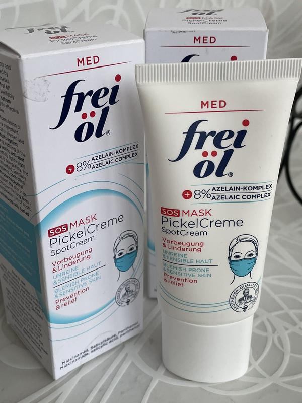 Оригінал Нова 🧚♀️FREI OL SOS Маска -крем для обличчя 👉🏻Об’єм 50 мл 📢Термін свіженький Frei Ol Med Care Sos Mask SpotCream — легка матувальна маска-крем, що усуває забруднення і зменшує висипання. Вона нормалізує виділення себуму та одночасно очищає і звужує пори, усуваючи фактори ризику акне. Легкий нежирний крем швидко всотується, його особлива формула дає інгредієнтам змогу діяти злагоджено в потрібній черговості. Активні інгредієнти: Azelaic Complex — регулює вироблення себуму; саліцилова кислота та ніацин — знімають запалення і подразнення; пантенол — заспокоює, відновлює; алое вера — зволожує, відновлює. Крем ефективно усуває наявні висипання і запобігає появі нових. Його можна використовувати для профілактики подразнення шкіри, наприклад, під захисною маскою для обличчя. Засіб пройшов дерматологічне тестування. Як використовувати Нанести крем-маску на попередньо очищену шкіру обличчя, а за потреби також на шию, декольте або спину (місця висипань). Німеччина 🇩🇪