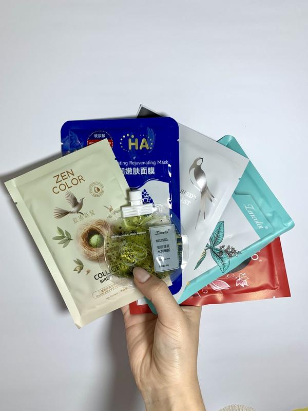 Набор из 6-ти масок для лица: 1. Отбеливающая nf увлажняющая маска Xodo, 25 ml 2. Маска с коллагеном bird’s best Zen Color, 25 ml 3. Маска с гиалурированной кислотой HA, 25 ml 4. Маска с маслом авокадо Zen Color, 25 ml 5. Увлажняя маска для сияния кожи лица Faziyan, 25 ml 6. Гель-маска с авокадо и чаем Zencolor,30 ml