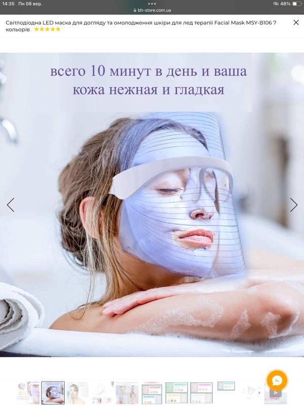Цей портативний апарат розроблений на основі фотодинамічної дії. Вона активізує процеси природного клітинного оновлення, сприяє відновленню шкіри, зменшенню пігментації, запалення, акне та зморшок. Світловипромінюючий діод спрямовує енергію на шкірний покрив, стимулюючи його відновлення. Маска мінімізує ризики виникнення алергічних реакцій, почервоніння та подразнень завдяки відсутності УФ-випромінювань. Червона світлова терапія: (довжина хвилі від 620 до 730 нм) Використовується для антивікових властивостей, завдяки своїй здатності стимулювати вироблення колагену та еластину. Також вважається, що він знижує кількість цитокінів, що спричиняють запалення. Синя світлова терапія: (довжина хвилі від 525 до 550 нм) Використовується через його антибактеріальні властивості і, отже, використовується для лікування акне. Ця певна довжина хвилі стимулює вироблення кисневих радикалів, які вбивають бактерії, що викликають вугри, не ушкоджуючи шкіру. Бурштинова світлова терапія: (довжина хвилі від 565 до 570 нм) Використовується для очищення токсинів зі шкіри, збільшення лімфатичного потоку та збільшення клітинного росту, сприяючи оновленню клітин або виробленню нових клітин шкіри. Як користуватися: Перед тим, як почати, переконайтеся, що ваша маска заряджена за допомогою кабелю Micro-USB (приблизно 30 хвилин). Очистіть шкіру та нанесіть улюблені сироватки, зволожуючі креми та тоніки для догляду за шкірою. Надягніть щит на обличчя Натисніть кнопку живлення, розташовану на лівій стороні пристрою, щоб розпочати сеанс світлодіодної терапії. Щоб змінити джерело світла, натисніть кнопку живлення, щоб вибрати колір залежно від бажаної лікувальної терапії. Маска працює за таймером автоспуску з кроком 15 хвилин. Щоб переключитися на інший колір або використовувати один колір більше 15 хвилин, знову клацніть Налаштування освітлення: Для терапевтичного лікування рекомендується використовувати кожне налаштування світла протягом 15 хвилин. Червоний: запалення/почервоніння. Синій: акне/вугри Бурштин: вікові плями/мелазма Стан чудовий. Працює без нарікань. Заряджається від мобільної зарядки. Продається без шнура і упаковки. Лише маска. Пересилка зі Львов