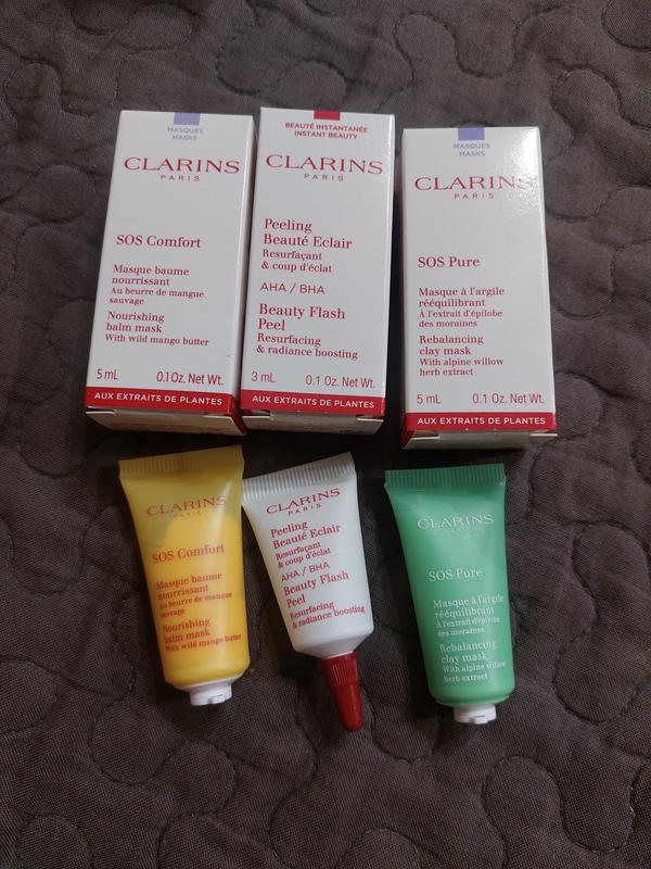 1. Clarins Beauty Flash Peel - Гелевый пилинг для лица с кислотами, пробный образец, 3 мл; 2.Clarins SOS Comfort - Маска для лица с маслом из мякоти манго, пробный образец, 5 мл 3.Clarins SOS Pure - Маска для жирной и комбинированной кожи лица с экстрактом снита, пробный образец, 5 мл;
