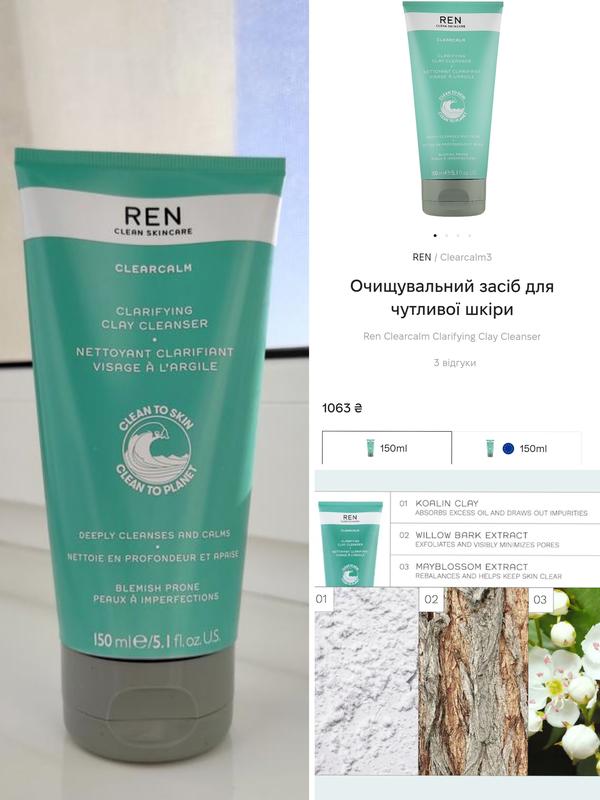 Очищающий гель для лица Ren Clearcalm Clarifying Clay Cleanser придает коже чувство чистоты и нежности Состояние: новый, оригинал из США Обьем: 150 мл (полноразмер, на мейк ап - свыше 1060 грн) Очищающее средство для чувствительной кожи от бренда Ren значительно повышает эффективность ежедневных уходовых процедур. Этот непенящийся продукт на основе каолиновой глины и натуральных экстрактов отлично устраняет загрязнения и себум, сужает поры, устраняет высыпания и предотвращает их появление в дальнейшем. Он обеспечит вам бесценные ощущения комфорта, свежести и чистоты, подарит кожному покрову ухоженный, сияющий вид. ✅ Особенности Ren Clearcalm Clarifying Clay Cleanser: - нежно и тщательно очищает лицо; - предназначено для чувствительной, проблемной и подростковой кожи; - каолиновая глина абсорбирует загрязнения и себум, а также оказывает детоксифицирующее действие; - экстракт коры ивы сужает поры; - кунжутное масло снимает воспаления, предотвращает сухость эпидермиса; - масло ромашки способствует нормализации сальных желез и успокаивает раздражения; - масло лаванды стимулирует процессы регенерации и заживления, а также эффективно борется с прыщами; - подходит для ежедневного применения; - не тестируется на животных; - емкость изготовлена из переработанного пластика.