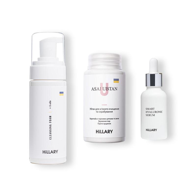 Доглядовий набір для нормального типу обличчя дбайливо очистить та зволожить шкіру завдяки органічним засобам, що входять до набору. Очищуюча пінка для нормальної шкіри з 5-ма оліями із сумішшю 5 олій створює речовину, подібну до ліпідного прошарку, що скріплює корнеоцити - клітини, що утворюють ороговілий шар шкіри, не шкодить мікробіому, підсилює ліпідобар'єр та зберігає природний Ph-баланс шкіри, ретельно розчиняє та видаляє навіть найстійкіший макіяж, надає шкірі обличчя приємного відтінку та вирівнює тон. Убтан для м'якого очищення і скрабування ASAI UBTAN глибоко очищає пори, усуває запальний процес, зволожує, не сушить шкіру, ніжно і дбайливо очищає її, не викликає подразнень чи будь-яких неприємних відчуттів, сприяє зменшенню постакне і пігментації а також не порушує мікробіом шкіри. А гіалуронова сироватка зволожує глибокі шари шкіри, попереджає старіння і відроджує молодість шкіри, відновлює і захищає, утримує вологу всередині шкіри, помітно скорочує зморшки, підтягує шкіру і надає їй сяйва. Під час масажу, властивості гіалуронової сироватки значно підсилюються. До набору входять: - Очищуюча пінка для нормальної шкіри Hillary Cleansing Foam + 5 oils, 150 мл; - Убтан для м'якого очищення і скрабування Hillary ASAI UBTAN, 100 г; - Гіалуронова сироватка Hillary Smart Hyaluronic, 30 мл. Спосіб застосування: 1. Невелику кількість пінки нанесіть на вологе обличчя легкими масажним рухами, ретельно промийте обличчя водою. 2. Невелику кількість порошку убтану насипте у долоню, додайте трохи води і розведіть до пастоподібного стану. Нанесіть на вологу шкіру, обережно розподіліть по всьому обличчю, помасажуйте і змийте. Можна застосовувати двічі-тричі на тиждень. 3. Нанесіть масажними рухами невелику кількість сироватки на чисту, вологу шкіру обличчя, шию і зону декольте.