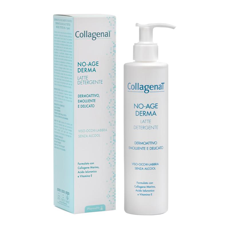 Лагідне молочко NO-AGE DERMA призначене для зняття макіяжу та щоденного делікатного очищення обличчя, очей і губ. Завдяки своїм цінним інгредієнтам, зокрема морському колагену, гіалуроновій кислоті, оліям кокоса й авокадо, маслу ши та вітаміну Е, продукт дарує відчуття повного комфорту після нанесення та лишає вашу шкіру бездоганно чистою, добре тонізованою й свіжою. Молочко запускає процеси омолодження і чинить розслабляючу та відновлюючу дію на втомлену шкіру, готуючи її до наступних етапів догляду. Зберігає природну гідроліпідну плівку шкіри. Колаген є основним протеїном, що робить нашу шкіру еластичною, пружною та підтягнутою. З плином часу через негативні зовнішні фактори, стреси та неправильний спосіб життя виробництво колагену організмом уповільнюється, а його нестача неминуче призводить до зниження тонусу шкіри, її провисання та появи зморшок. Італійський бренд Pharmalife Research пропонує інноваційну серію дермокосметики CollagenaT, що повністю відповідає вимогам часу і вашої шкіри. CollagenaT – це ваш новий потужний інструмент проти ознак старіння. Основою кожного продукту лінійки є високий вміст гідролізованого колагену морського походження, що пройшов ферментативний гідроліз. Внаслідок цього процесу колаген гідролізується до малих часточок, які повністю поглинаються не лише епідермісом, а й наступним шаром шкіри – дермою. «Подрібнений» колаген відмінно засвоюється шкірою та стає необхідною основою для синтезу власних колагенових волокон. Завдяки високій концентрації морського колагену в засобах лінійки CollagenaT і підсилення його дії іншими цінними антивіковими складовими, в шкірі запускаються потужні омолоджуючі процеси. Ба більше, лінійка надає повноцінне природне зволоження і прицільне живлення шкіри завдяки синергії ретельно підібраних компонентів. Різноманітні та приємні у використанні продукти забезпечують цілодобовий догляд за вашим обличчям, день за днем повертаючи йому юнацьку гладкість, пружність і свіжий вигляд. Підходить для всіх типів шкіри, навіть для найніжнішої та чутливої. Дерматологічно перевірено. Тестовано на нікель. Продукт не містить глютену, лактози та шкідливих для здоров’я речовин.Номер партії Lotto 24223, термін придатності до 05.2027