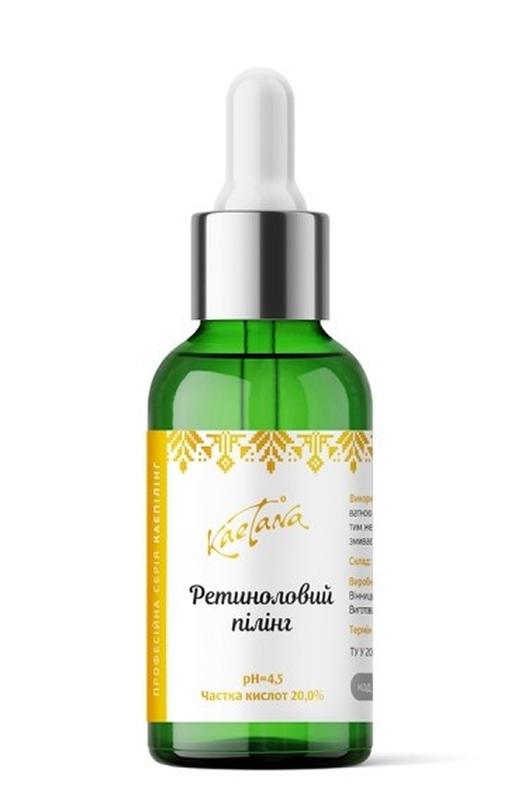 Описание: Ретиноловый пилинг, рН-4,8, 20%. Поверхностный пилинг с результатами срединного. Ретиноловый пилинг работает не только с эпидермисом, но и с срединными слоями кожи, однако, несмотря на это, он достаточно безопасен. Пилинг способен справится с морщинами разной степени глубины, возрастными изменениями кожи, рубцами и постакне, включая очень глубокие и келоидные образования. Один из немногих видов химического пилинга, который успешно борется с гиперпигментацией. Замечено, что для многих эффект от двухразового ретинолового пилинга равен эффекту от 10(!) сеансов пилинга гликолевой кислотой. Многие косметологи советуют начинать омоложение именно с этой процедуры. На фоне ретинолового пилинга возникают отечность и покраснение, но это нормальная реакция, которая проходит при правильном уходе через несколько часов. Также особенностью данного вида пилинга является онемение и парестезия (вид нарушения чувствительности, который включает в себя субъективные ощущения покалывания, жжения, «ползания мурашек»). Это также обычная для данного пилинга реакция, которая не требует особого вмешательства и проходит сама собой. Нужно предупредить об этом клиента заранее. Помните: эффект срединного пилинга! Ретиноловый пилинг -- процедура, в основном, для зрелой кожи. Возраст возможных клиентов - от 35 до 50 лет. Для тех, кому меньше 35-ти, ретиноловый пилинг будет полезен в случаях, если на коже присутствуют: слишком яркая и насыщенная пигментация; выраженные рубцы от угревой сыпи; первые признаки деструктивных изменений кожных покровов; угри; чрезмерная активность сальных желез (жирная себорея). Состав: Спирт этиловый, вода очищенная, ретиноловая кислота 5%, резорцин 15%. Протокол процедуры Очищение проводится обычным способом: «Гель демакияжный», «Фитопилинг», «Пилинг Хлопковый». Далее наносится сам ретиноловый пилинг. Минимальное время экспозиции: средство втирается (ватной палочкой или руками в перчатках) в течение 5 минут, кожа подсушивается, затем наносится повторный слой пилинга (тем же образом). При необходимости, также наносится и третий слой. Последний слой пилинга смывается самим клиентом уже в домашних условиях, через 10 часов (в среднем). Рекомендуемое количество процедур: 2-3 процедуры один раз в неделю с интервалом 2-3 месяца. Обязательна УФ-защита кожи. Постпилинговый уход Кожа восстанавливается за 1-2 дня. Шелушения и покраснения есть, но они минимальны. Если вспомнить о том, что обычно период восстановления занимает от 5 дней до двух недель, то разница очевидна. Основная цель постпилингового ухода - восстановление барьерной функции эпидермиса. Уходовые средства должны иметь в своем составе антиоксиданты, использовать их можно только через несколько дней («Каэмульсия» идеально подойдёт); Появившиеся корочки нельзя принудительно снимать, а процесс шелушения ускорять; Для умывания нужно использовать обычную комнатной температуры воду; При выходе на улицу обязательная мера защиты - нанесение солнцезащитного крема или Молочка с SPF-50 в летнее время и СПФ-25 в зимнее. Необходимо отказаться от декоративных косметических средств в течение 5-6 дней после процедуры; В течение 5-7 дней после процедуры необходимо наносить «Крем успокаивающий после химических пилингов с SPF-15» утром и «Сыворотку сверхуспокаивающую после травматических процед
