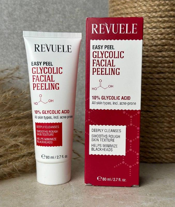 REVUELE EASY PEEL GLYCOLIC FACIAL PEELING. Цей продукт є доступною альтернативою хімічному пілінгу, який зазвичай виконують в салонах, і призначений для використання вдома. Він містить оптимальну концентрацію гліколевої кислоти, вважається найефективнішою AHA-кислотою для відлущування, особливо корисною для шкіри, схильної до збільшеного виділення себуму та появи прищів. Пілінг видаляє відмерлі клітини, надлишок себуму і бруд з епідермісу, сприяючи вирівнюванню текстури шкіри та тону, а також попереджаючи виникнення висипань. При використанні 1-2 рази на тиждень він сприятиме свіжому, гладкому та здоровому вигляду обличчя. Інструкції: Наносити ввечері тонким шаром на очищену і суху шкіру, уникаючи областей навколо очей та губ. Змивати водою не пізніше 10-15 хвилин після нанесення. Використовувати не більше 2 разів на тиждень. Вранці використовуйте засоби для захисту від сонця. Обережно: Індивідуальна непереносимість до будь-яких інгредієнтів можлива. Перед першим використанням виконайте тест на чутливість. Очікується легке поколювання. У випадку збільшеного дискомфорту або почервоніння негайно припиніть використання продукту і ретельно промийте водою. Уникайте потрапляння в очі! Якщо продукт потрапив в очі, негайно ретельно промийте водою! Глибоко очищує Вирівнює текстуру грубої шкіри Допомагає зменшити чорні точки